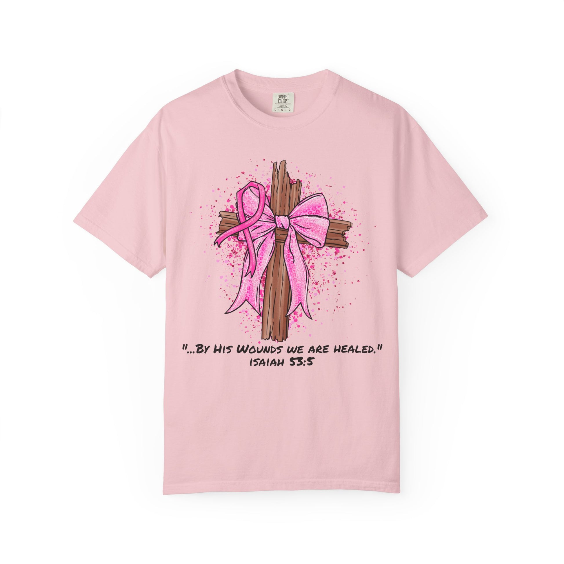 Celebrate strength and faith with this beautiful Garment-Dyed T-shirt. The soft cotton and relaxed fit ensure all-day comfort, making it perfect for casual outings. Featuring a heartwarming design of a cross adorned with a pink ribbon, this tee evokes feelings of hope and healing. Ideal for advocates of breast cancer awareness or simply as a daily reminder of faith.